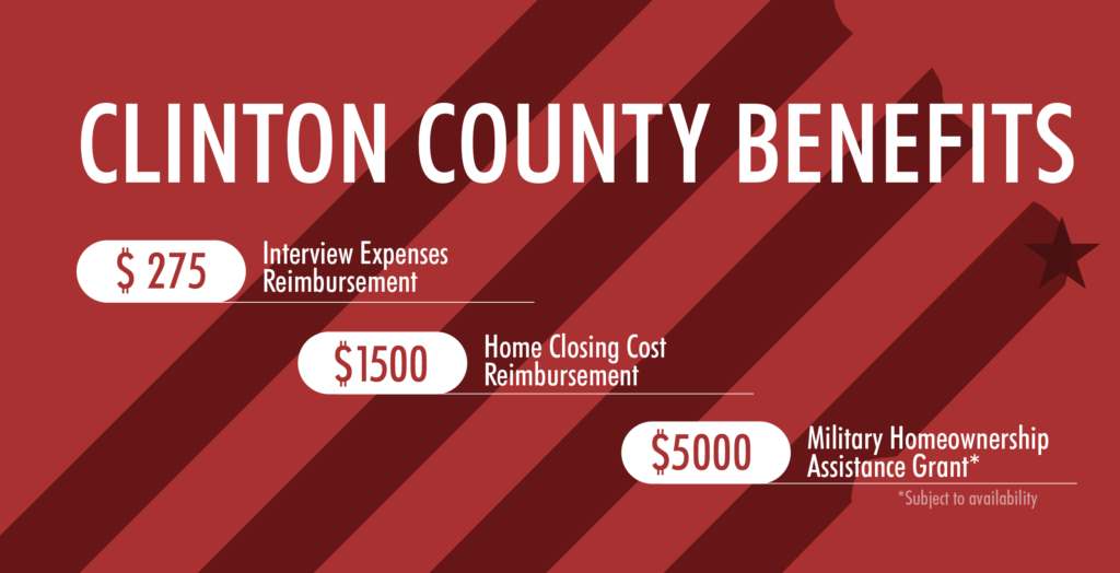 - A one-time home purchase closing cost reimbursement of up to $1,500 for a home located in Clinton County.