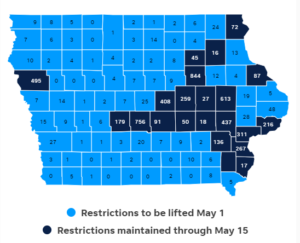 Today, Iowa Governor Kim Reynolds signed an updated proclamation requiring social distancing and reasonable public health measures doe many social, community, business, and leisure activities.